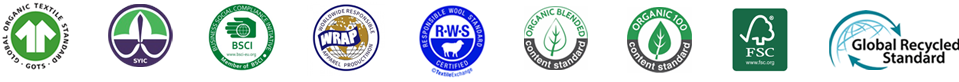 我们注重产品质量管理,拥有全球BSCI和WRAP等认证,同时注重产品的环保理念,以绿色有机环保为宗旨,通过了GOTS、GRS、OCS、FSC 等国际环保认证